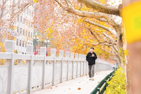 12月3日,张湾区车城西路的行人漫步在金色的梧桐树下,感受冬日的绚丽。