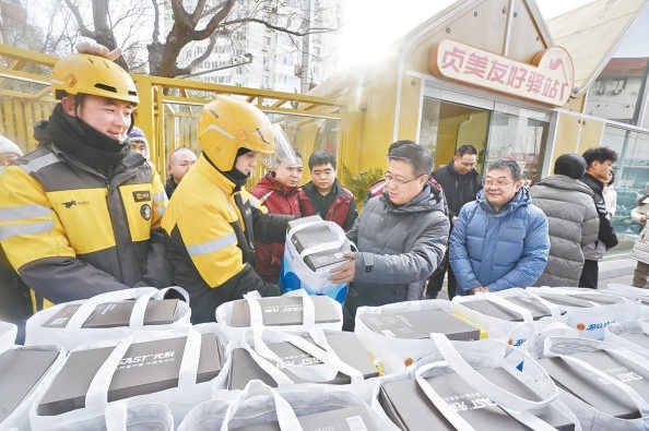△昨天,人们在安贞街3月9日前区看望户外工作者。