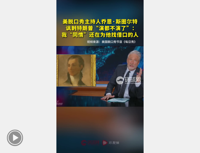 【环球网报道】据美国杂志《综艺》报道,当地时间1月5日播出的美国脱口秀节目《每日秀》上,主持人乔恩·斯图尔特就美国对委内瑞拉的军事行动讽刺美国总统特朗普称“我已经演完了”。他讽刺地表示,他为那些仍在为特朗普找借口的“阿谀奉承者”感到难过。 “他们还没有收到通知,不再需要用所谓的‘伟大民族理想’来包装我们的鲁莽行为。”