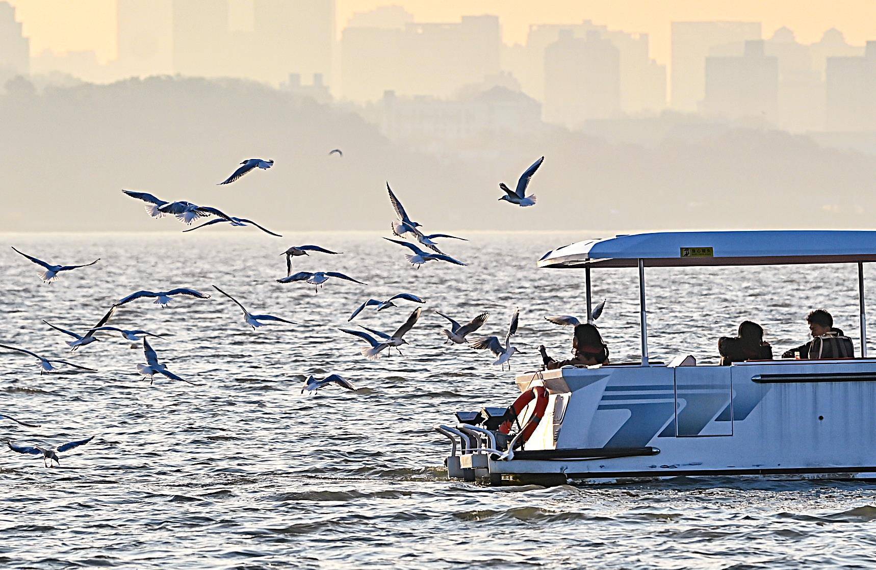 1月9日,不少市民和游客在武汉湖东部磨山湖畔以及中丰园至磨山之间的游船上喂食红嘴鸥,成群的红嘴鸥聚集在一起争夺食物。尤其是游轮乘客,可以近距离接触这些美丽的精灵,观看红背鸥在游轮旁飞翔,沉浸在冬日东湖独特的生态美景中。每年冬天,一群西伯利亚“白色精灵”红嘴鸥都会及时抵达武汉东湖,开始它们的冬季之旅。 (湖北日报全媒体记者 朱西勇 提供)